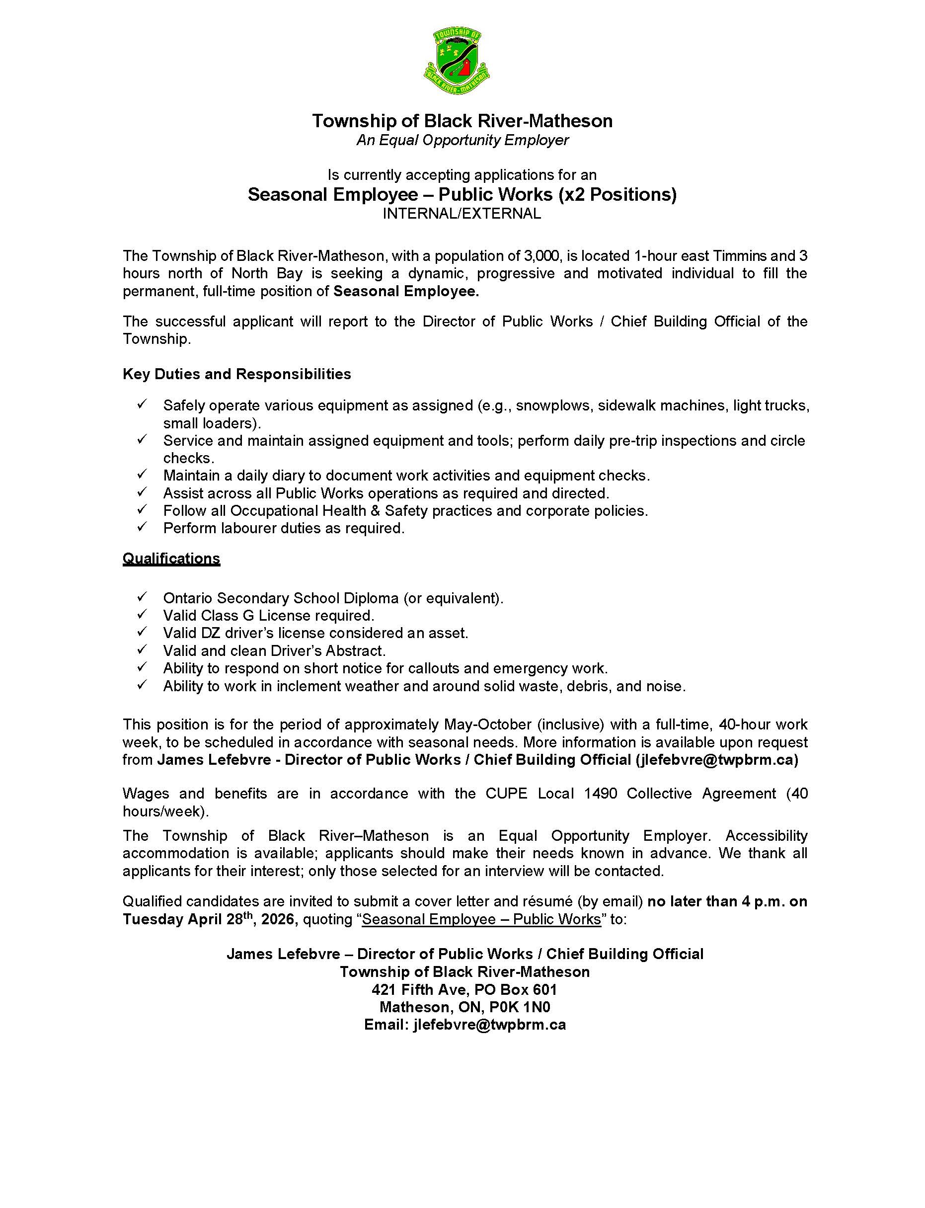 Job Posting - Seasonal Employee - Public Works x 2