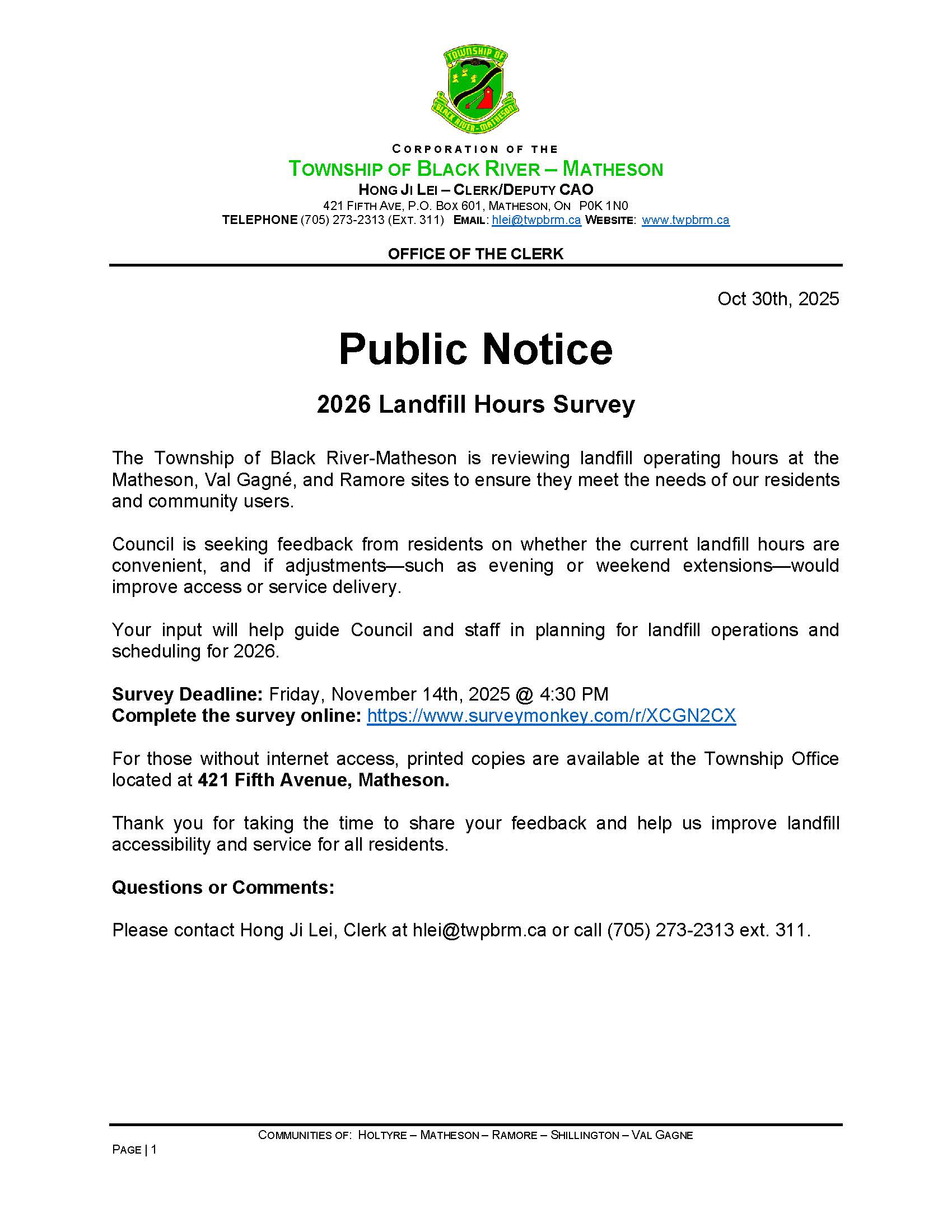 Paper copies: Township Office, 421 Fifth Avenue, Matheson.