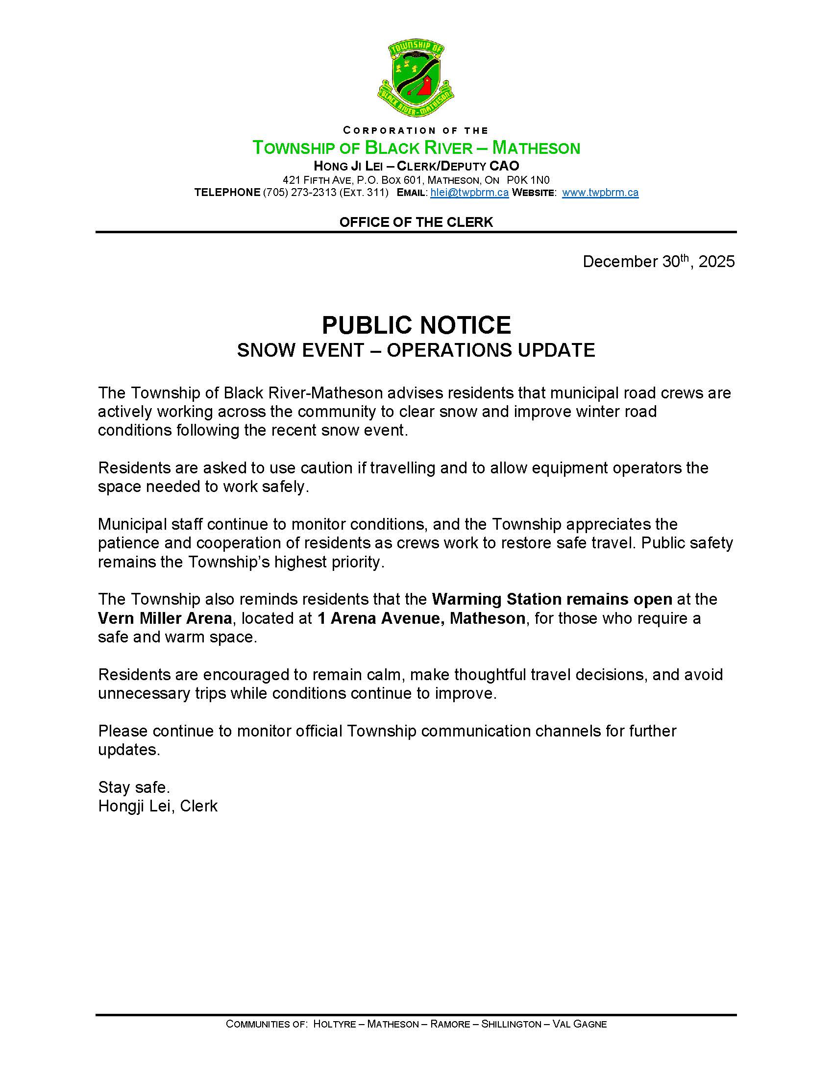 Public Notice - Operations Update Dec 30