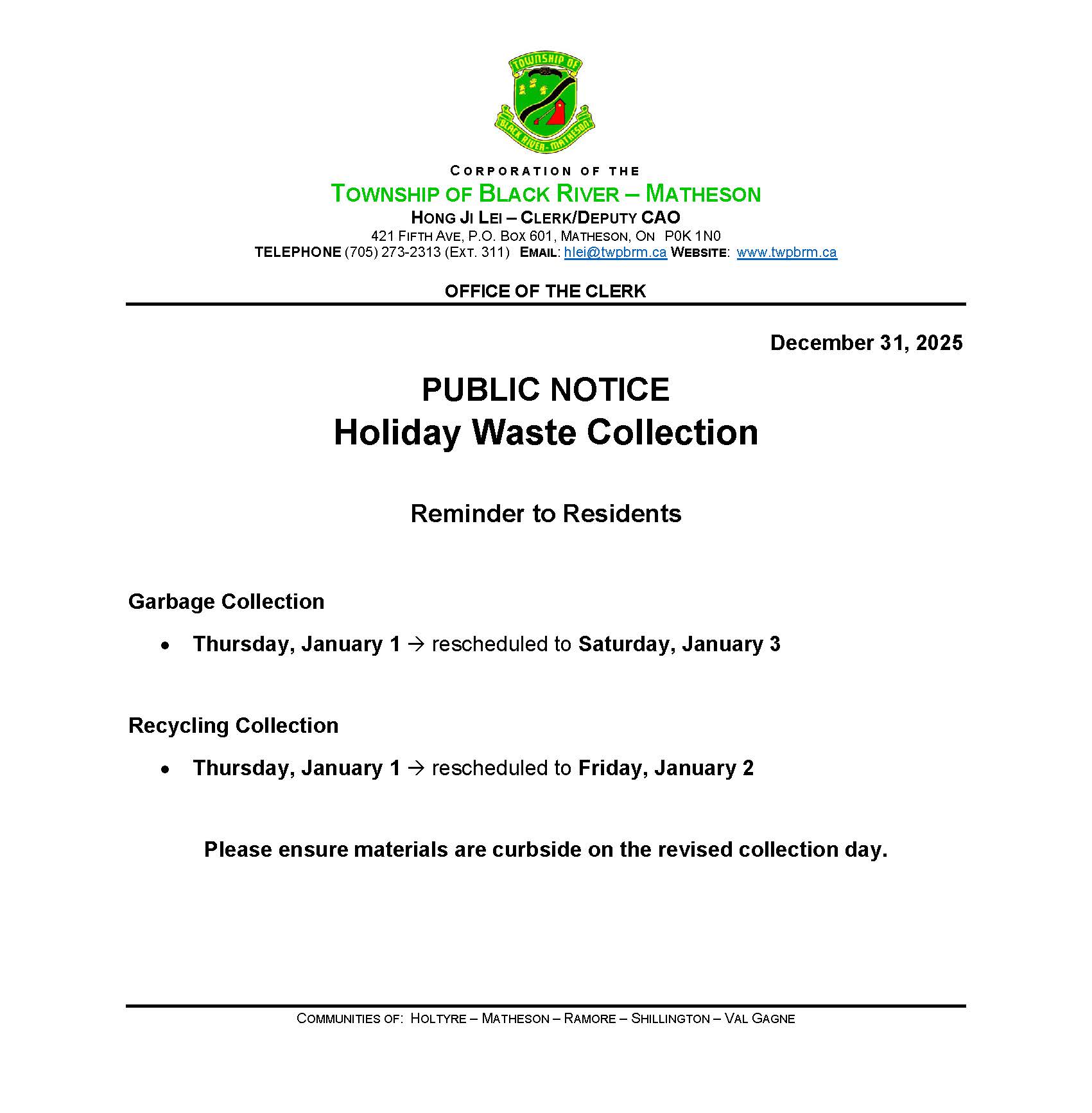 Public Notice - Waste Collection Update