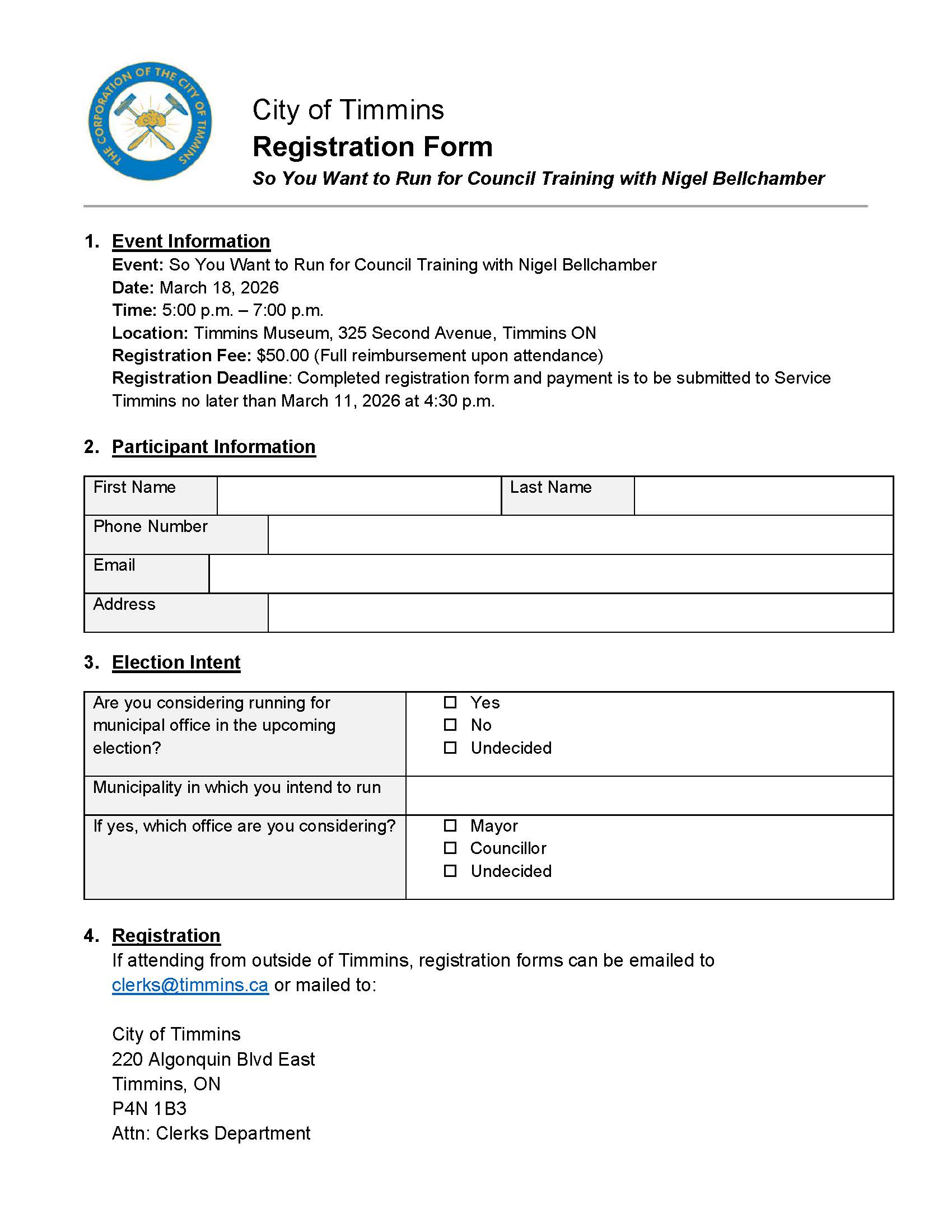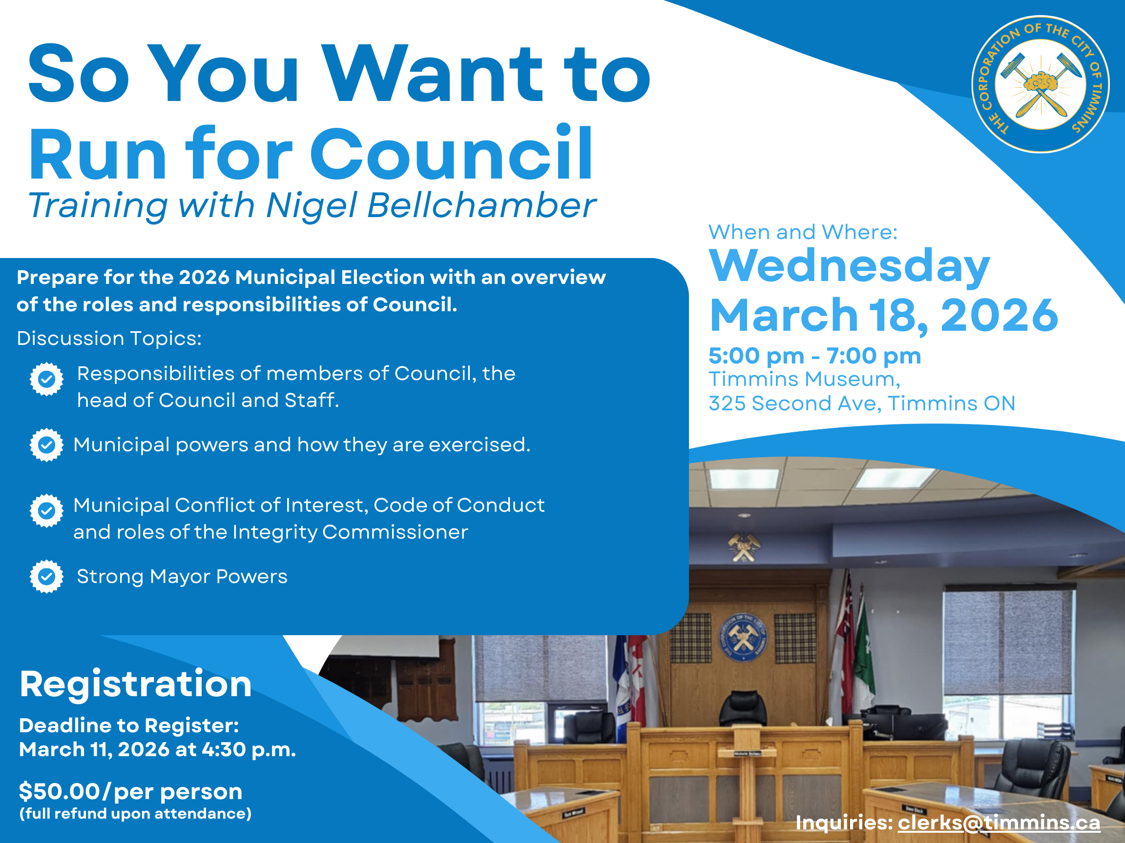 Join “So You Want to Run for Council” on Wednesday, March 18, 2026 (5:00–7:00 p.m.) at the Timmins Museum.