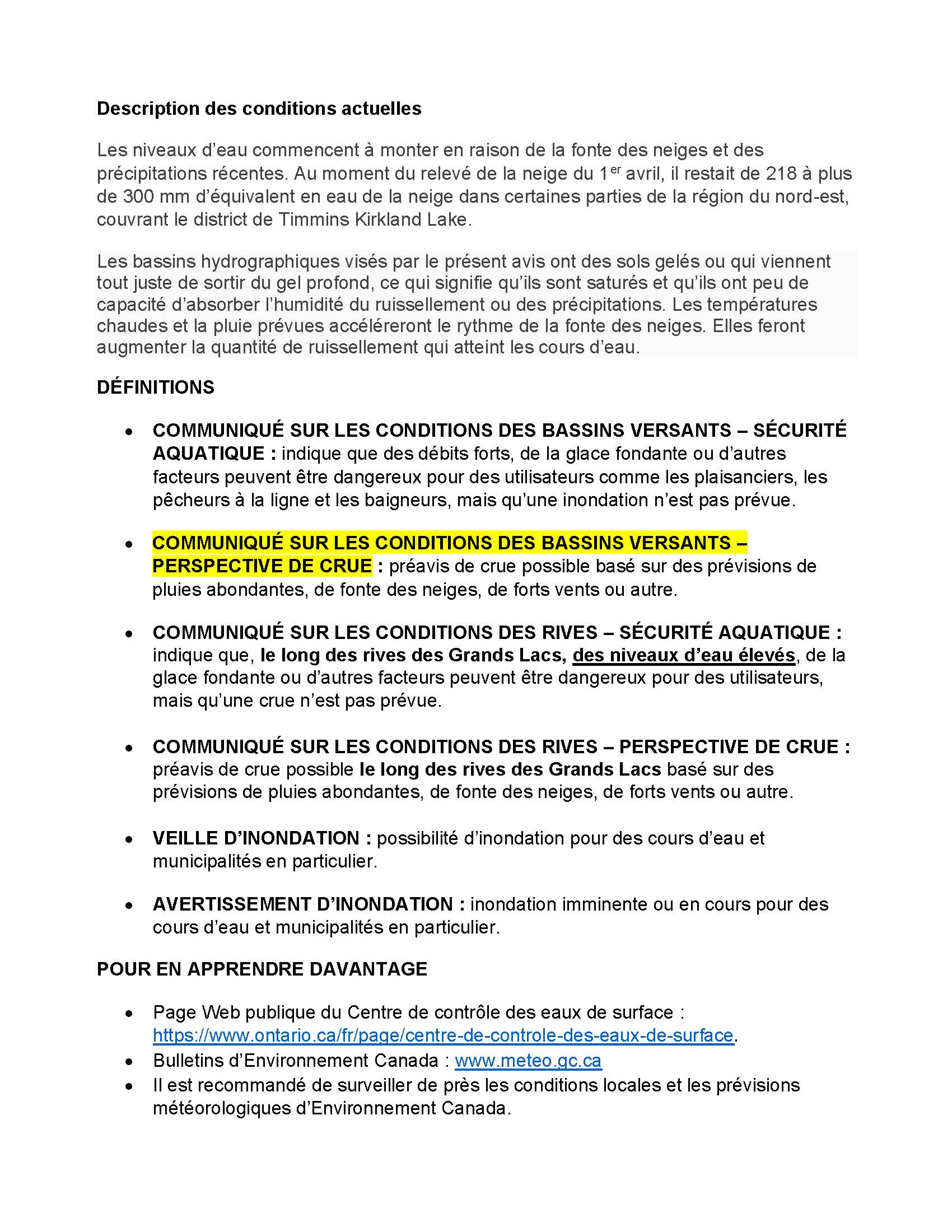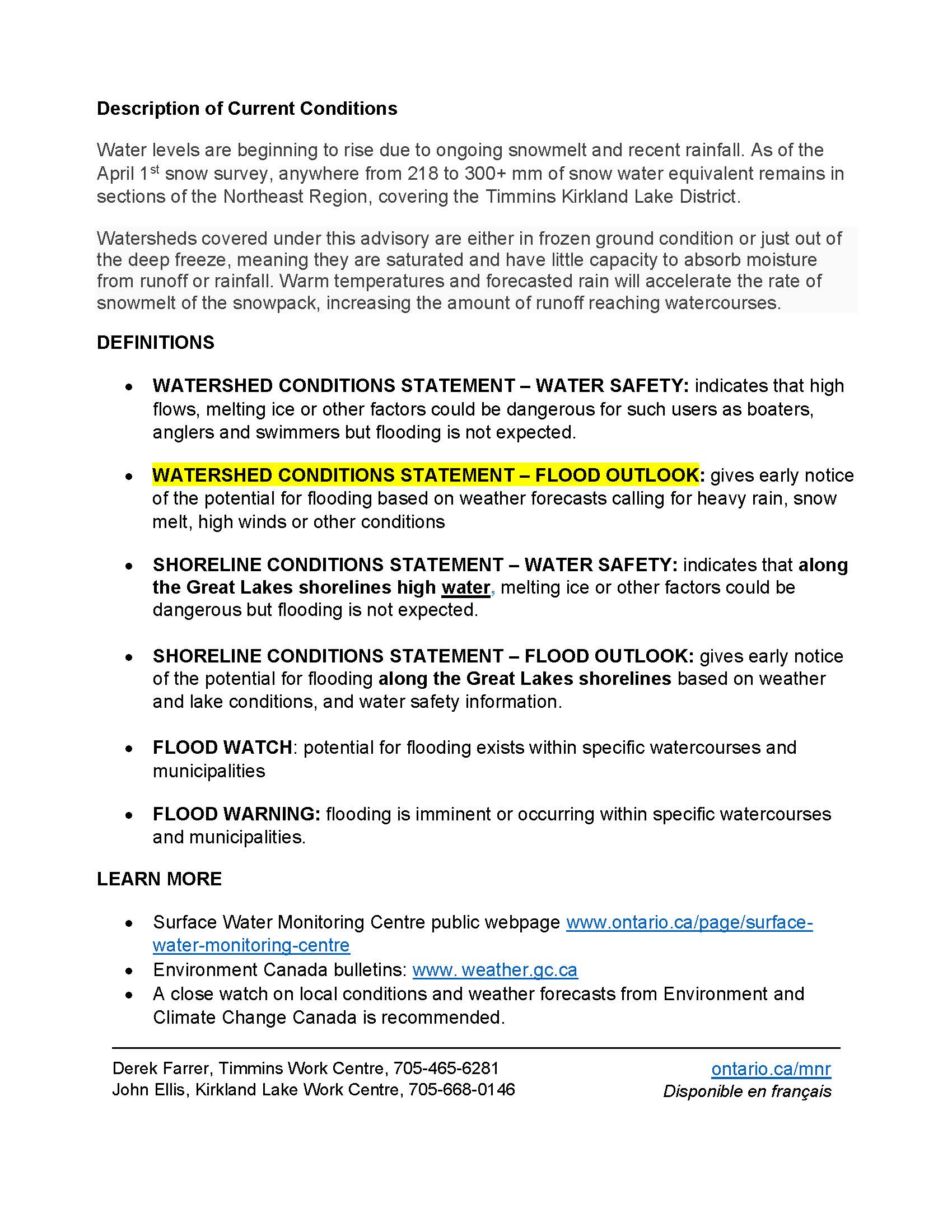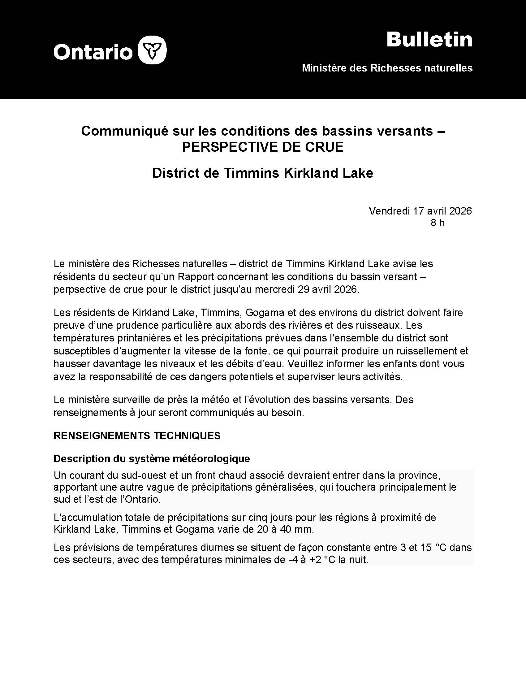 Timmins - Kirkland Lake District - Flood Outlook 2026-04-17